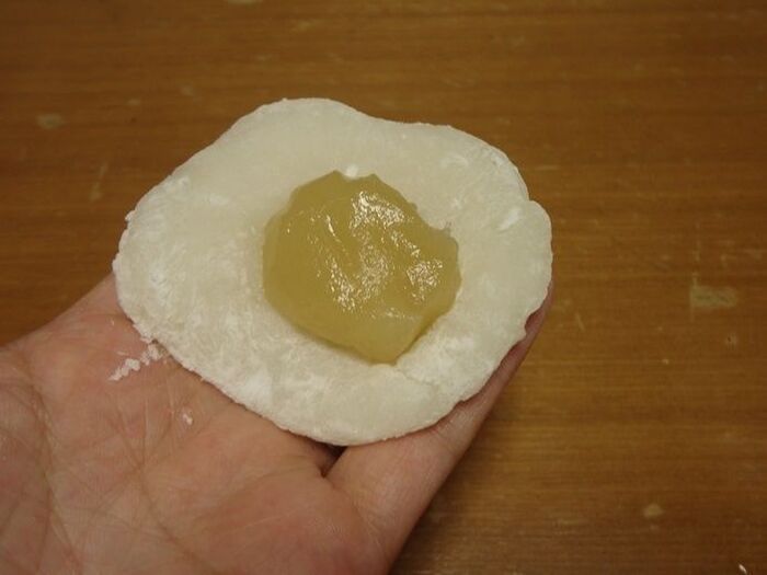 大福の生地が冷めたら12等分にして、片栗粉をつけながら丸くのばします。
