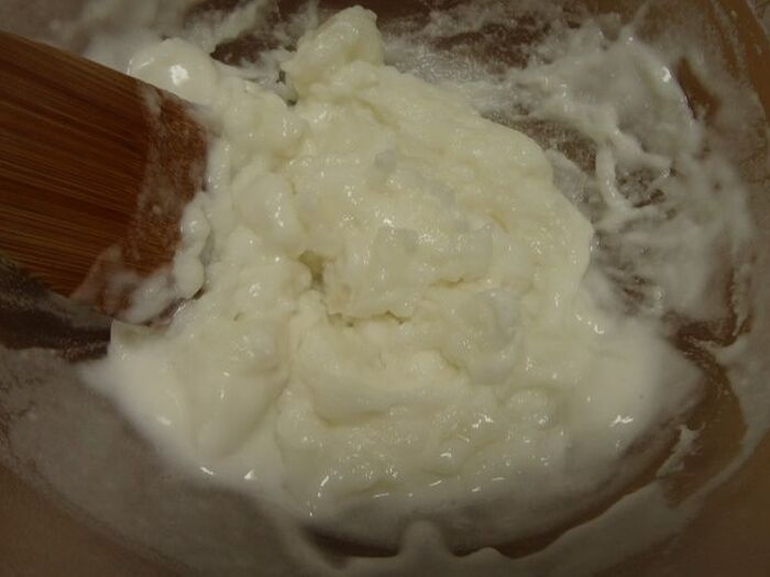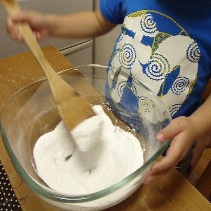 餅の生地をしっかり混ぜ合わせるともちもちになります。