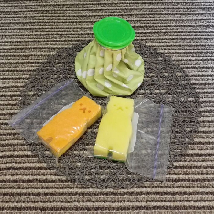 凍ったスポンジを、飲料水を購入した時に付いてくるおまけの、このペットボトルカバーに入れて
