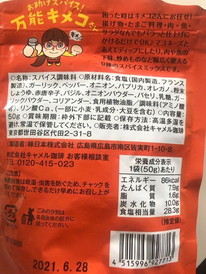 ガーリック、ペッパー、オニオン、パプリカ、オレガノ、赤唐辛子、バジル、オニオンパウダー、コリアンダーと9種のスパイスミックス‼️