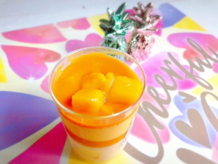 見ただけでワクワク♡マンゴーピューレの下に層になったスポンジやクリームがキレイ♡