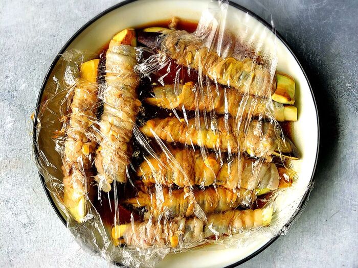 2.大きめの耐熱皿に並べて●を回しかける。ふんわりラップし、600Wのレンジで8分加熱する。