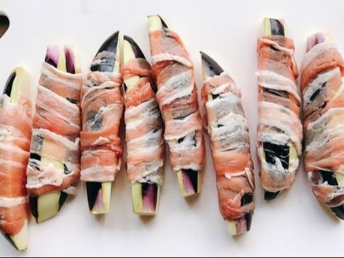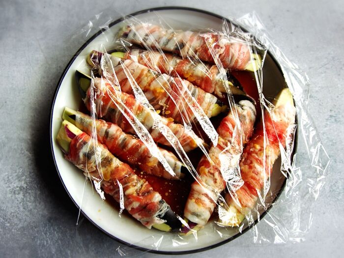 1.なすはピーラーで縞目に皮を剥いて縦4等分に切り、水に3分晒して水気を切る。豚肉を1枚ずつ巻きつける。●は合わせておく。