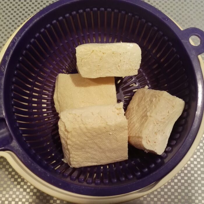 ザルに入れて、重石をして20分ほど水分を抜きます。