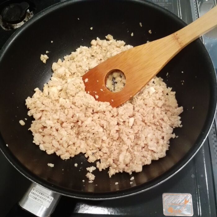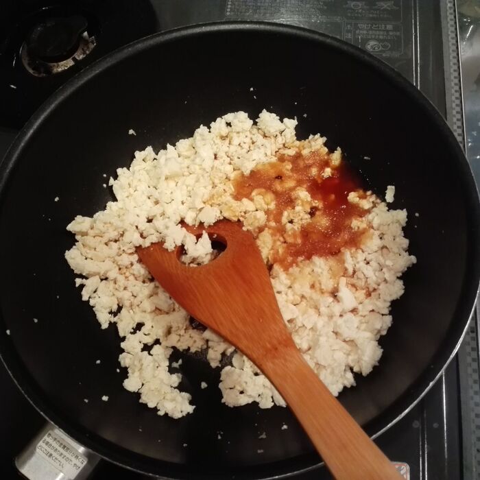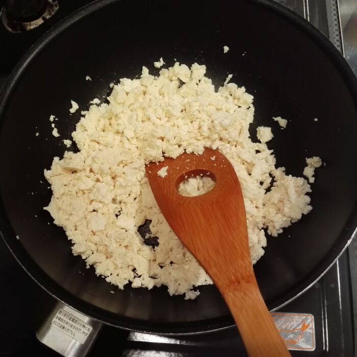 フライパンにお豆腐を入れて、完全に水分がなくなるまで細かくしながら炒ります🎵