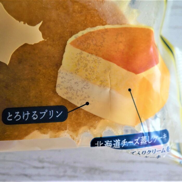 固めのビニール型を、剥がすととろけるプリンとチーズ蒸しケーキの2層が!!