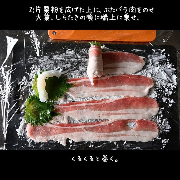 2:片栗粉を広げた上に、豚バラ肉を並べ