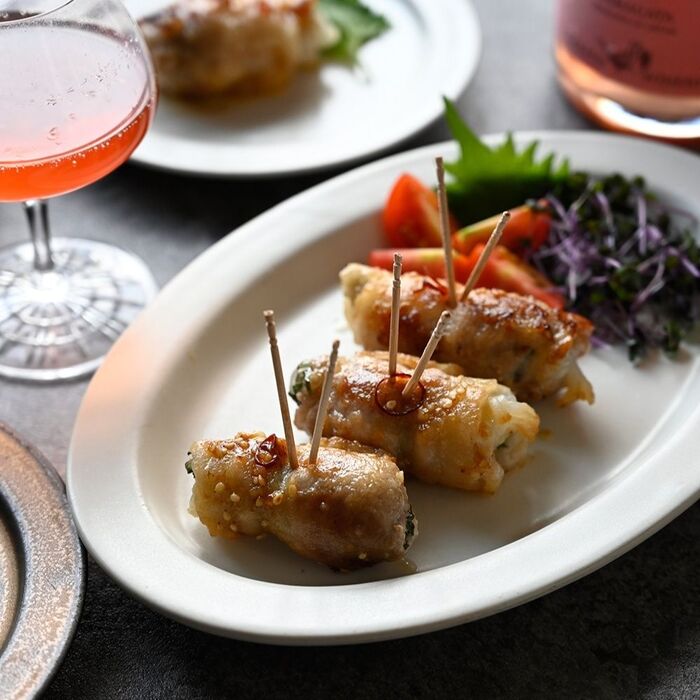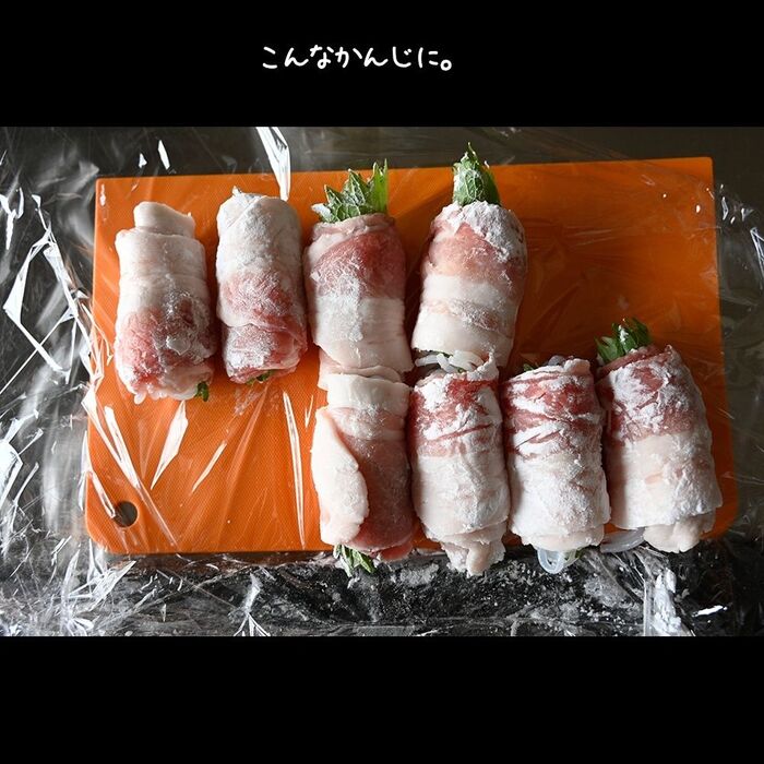 大葉、しらたきの順に端にのせ、くるくると巻く