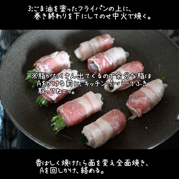 3:ごま油を塗ったフライパンの上に巻き終わりを下にしてのせ、中火で焼き