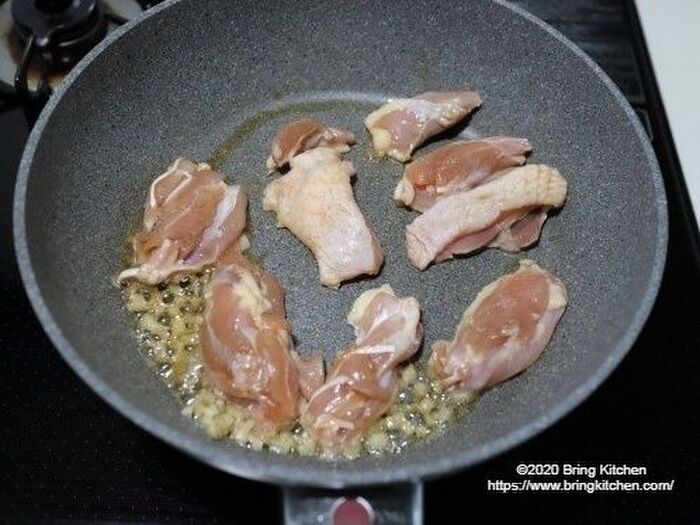 生姜から泡が出てきたら鶏もも肉を入れて焼く。