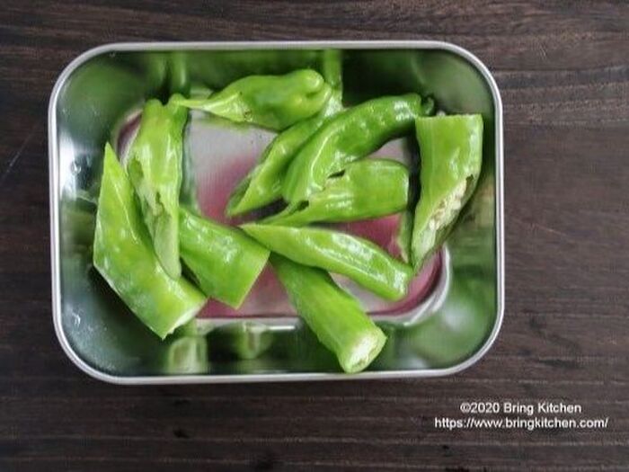 ししとうはヘタを落とし、大きければ半分に切る。