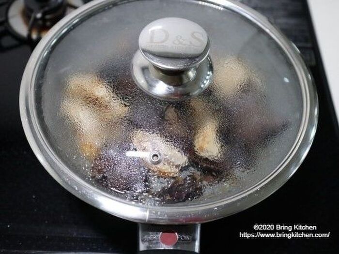 蓋をして蒸し焼きにする事により、鶏肉に中まで火を通します。
