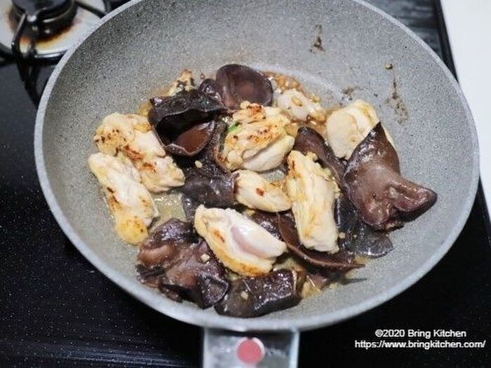 焦げ目がついたらひっくり返し、生きくらげを入れてひと混ぜしたら、酒、醤油を加える。