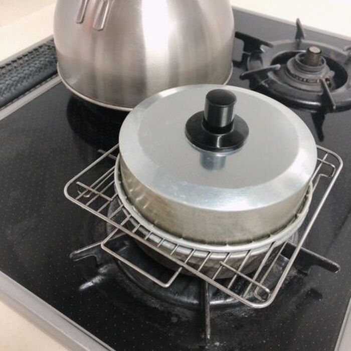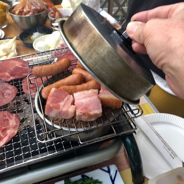 すもーくんミニは卓上コンロで使います。コンパクトサイズなので薫製しながら横の空いてるスペースで他の材料を焼いたりできますよ〜^_^