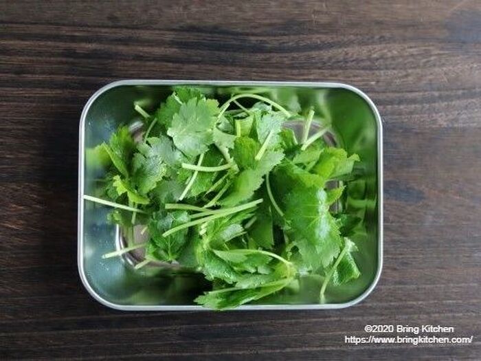 麺を皿に盛りつけて、9.をかけ、三つ葉をトッピングしたら完成。