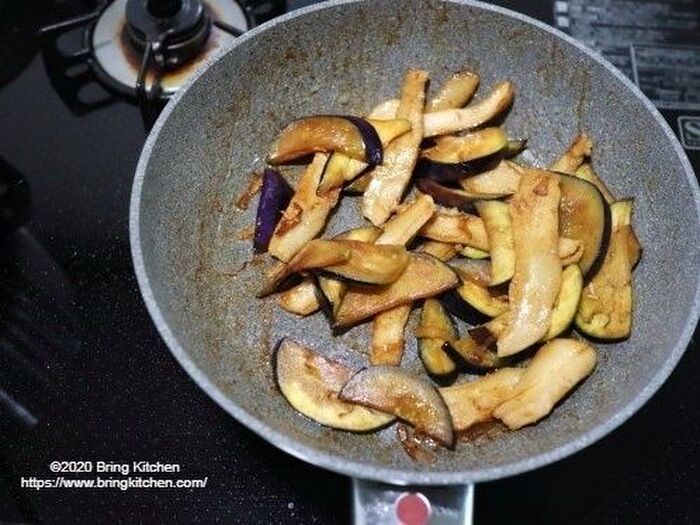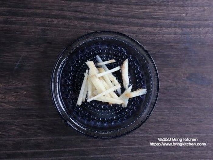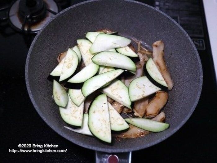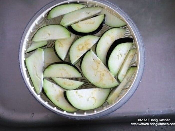 茄子はヘタを落とし、縦半分に切った後、斜め薄切りにし、水に一旦さらす。