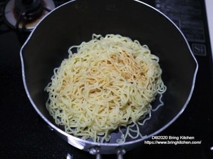 中華麺は、水気をしっかりと切り、最後は絞るようにして水気を切ります。