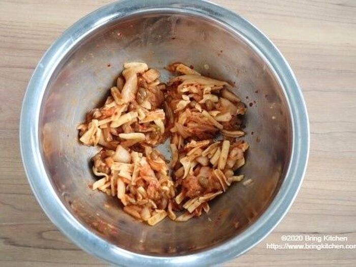 ボウルにキムチを入れて、キムチをハサミで細かく切る。
