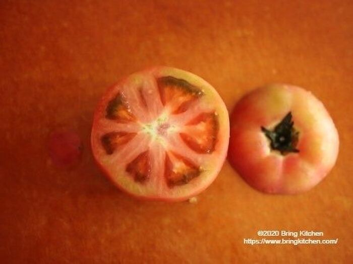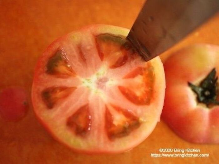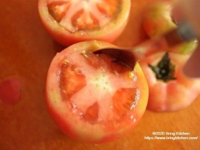 くり抜いたトマトの種の部分は水分が多いので、他の料理に使います。