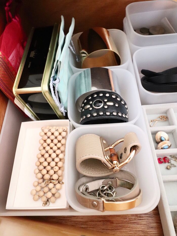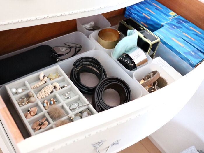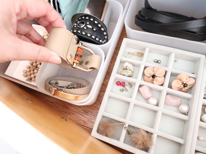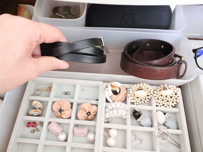 ピアスの奥には無印良品のポリプロピレンシリーズを使ってベルトを収納。