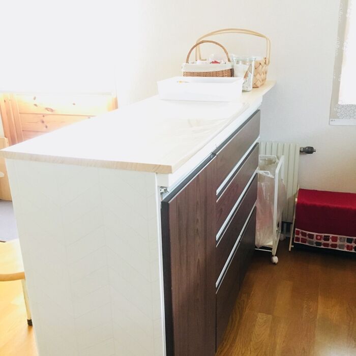 DIYしたキッチンカウンター横に置いて、ビビットなデザインを楽しんでいます。