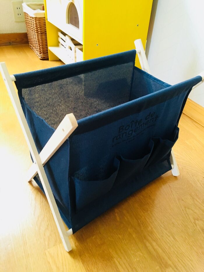 折りたたみ式のシンプルなデザインです。収納部分は横幅35㎝、高さ30㎝、ガバッと開くと20㎝以上開くので収納力もあります。手前にはポケットが3つあるので、ハサミや紐などまとめる道具を収納しておくこともできます。