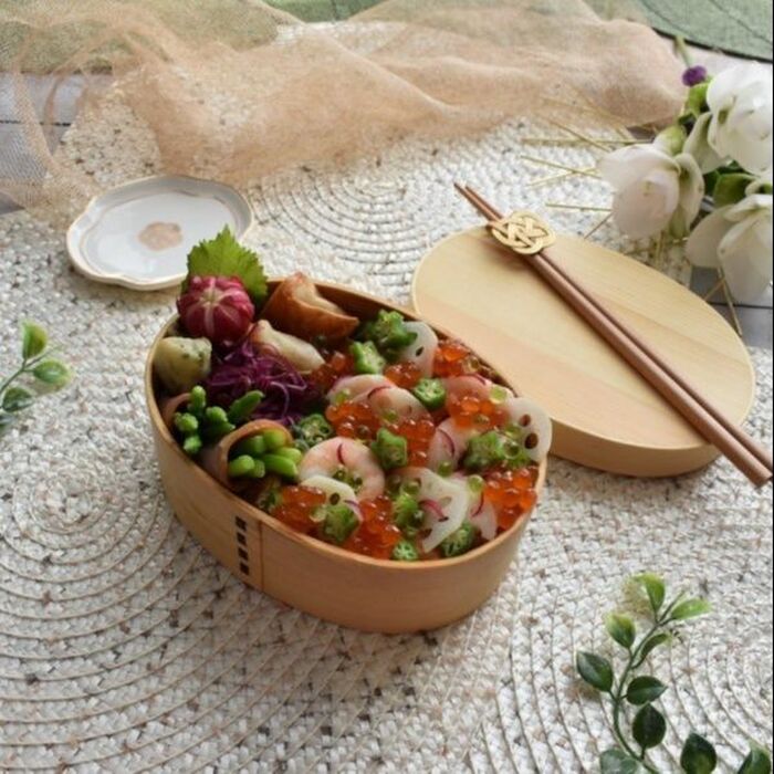 上にはレンコン エビ 鮭 オクラとイクラ、ワサビーズをちらしました。