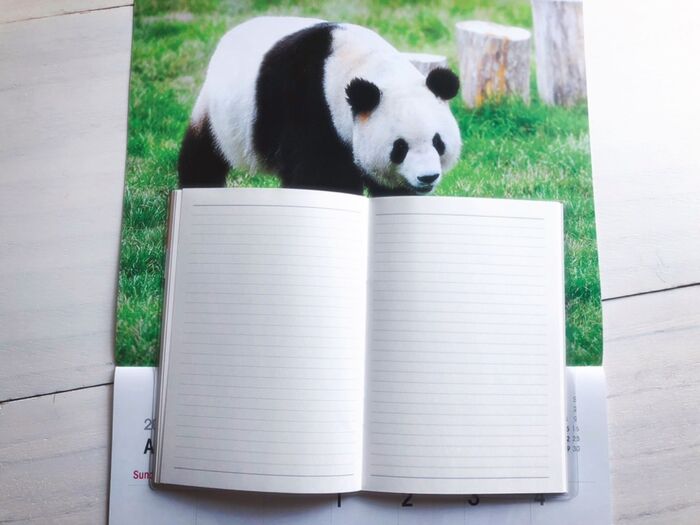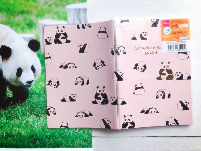 ピンクベージュにほのぼのするパンダのイラストが可愛いです♡表紙の文字と大きいパンダがゴールドでオシャレ♡