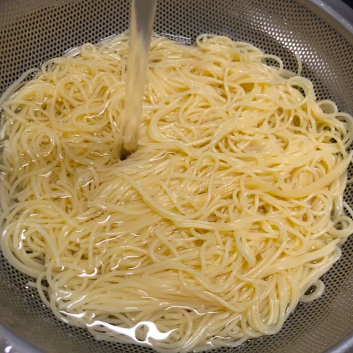 たっぷりのお湯でパスタを表示通りゆで、冷水(氷水)でしっかりと冷やす。《中火〜弱火》