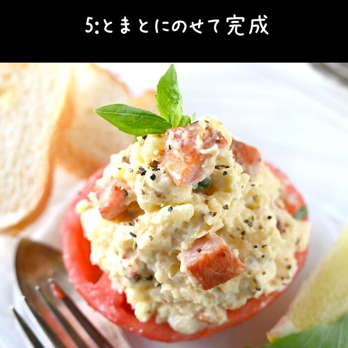5:トマトのうえにこんもりと盛り、お好みで粗びき黒こしょうを振る。