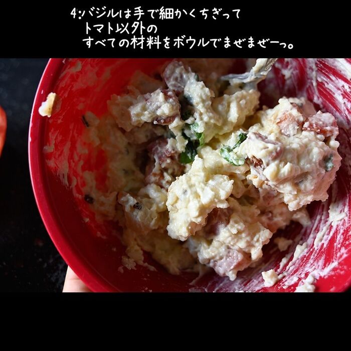 4:トマト以外の材料をボウルに入れ(バジルは手でちぎり入れる)じゃがいもを潰しながら混ぜ合わせる。