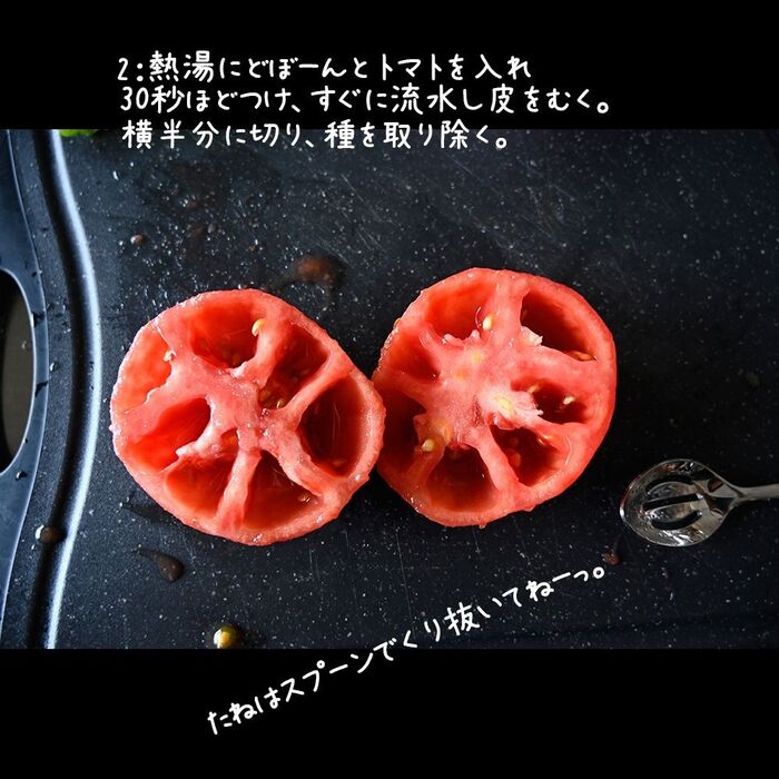 2:トマトが浸かる量の湯を沸かし、とまとを入れ30秒ほどつけ