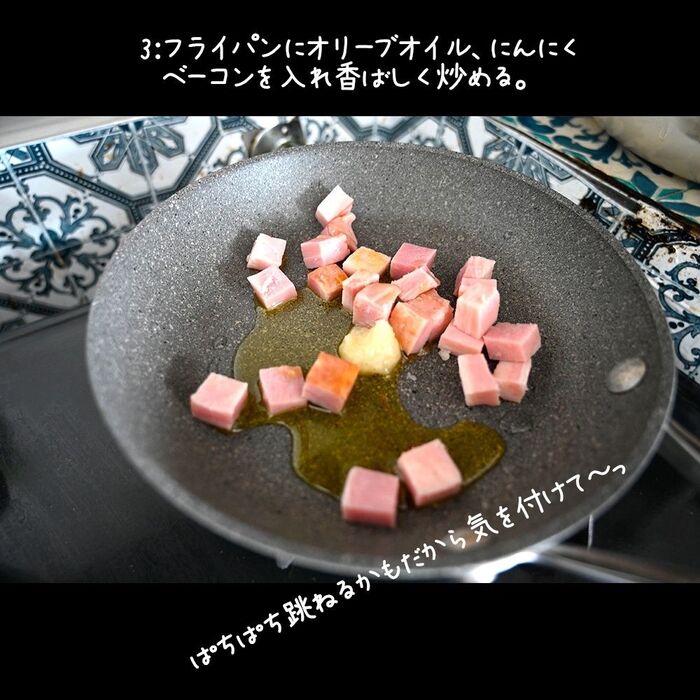3:フライパンにオリーブオイル、にんにく(入れる人は)、ベーコンを入れ香ばしく炒める。