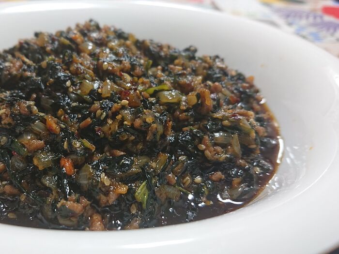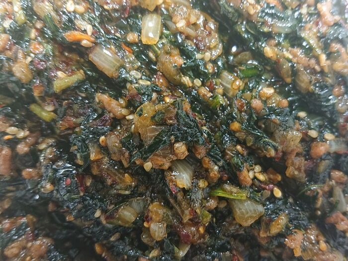 醤油、顆粒だしを加えて、更に炒め・・・・食べるラー油を加えて水分がなくなるまで炒める。