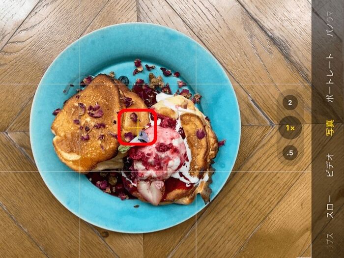 便利なグリッド線は料理を撮る際にも大活躍!パンケーキなど高さのある料理は斜俯瞰(斜め上)から撮影すると、よりおいしそうに撮影できます。