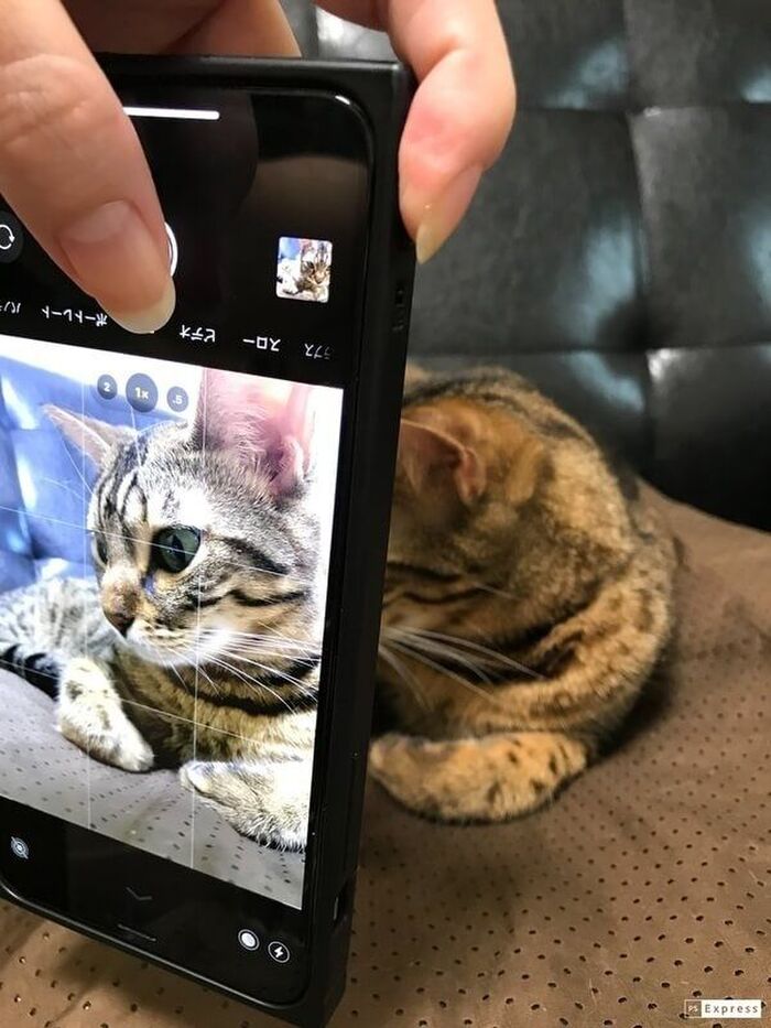 スマホを正位置で撮影すると折角のクリクリお目めも細く見えてしまいます。そんなときはスマホをくるっと逆さまにすれば、低い位置から狙え、可愛らしい表情がキャッチできるようになります。