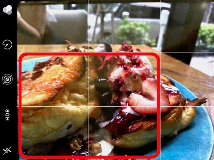 その際、単純に真ん中に料理を入れるのではなく、グリッド線を活用して、画面の2/3に料理を配置します。そうするだけで、周辺の雰囲気を感じることができる素敵な写真に。