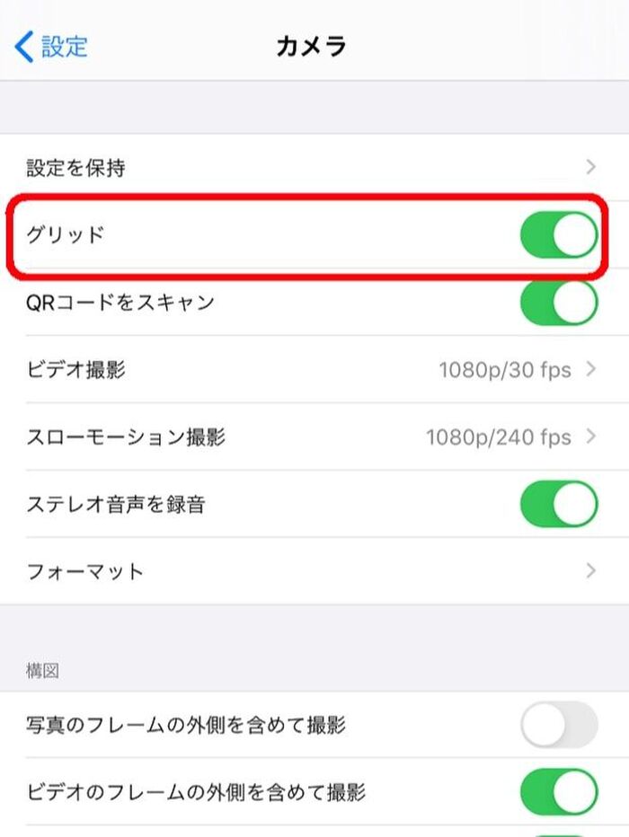 グリッド線の表示方法は、設定アプリ内のカメラ設定から、グリッドをONにするだけ。
