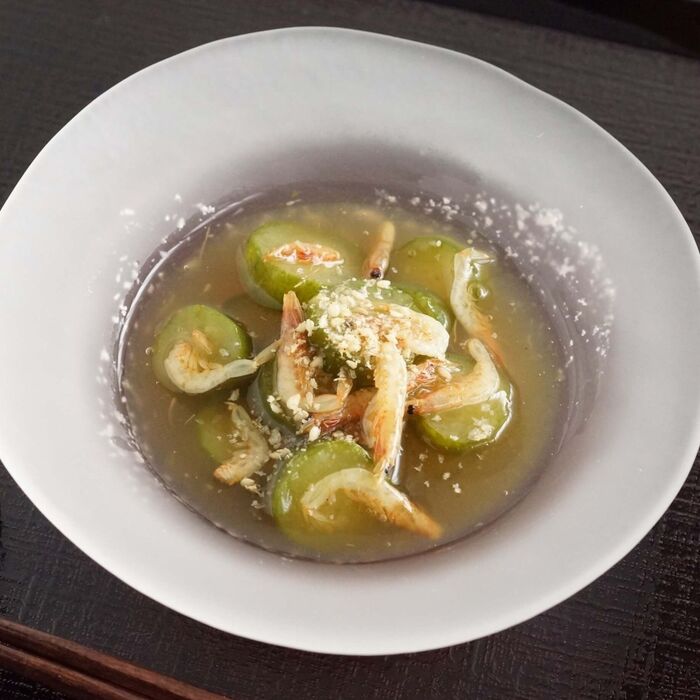 鍋に干し海老と水、料理酒、七彩べじぶろす、きゅうりをいれて火にかける。沸いたら弱火にする。