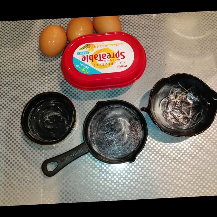この器から直接食べないので、移しやすくするためにマーガリンを塗ります。