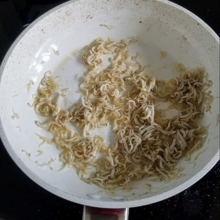 フライパンにごま油を入れて中火にかけて、ごま油が温まったらしらすを入れ、しらすが跳ねてきたら弱火にして30秒程度炒める。