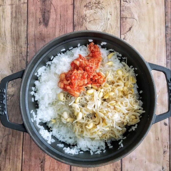 味付けもやし、キムチ、塩を入れてよく混ぜる。
