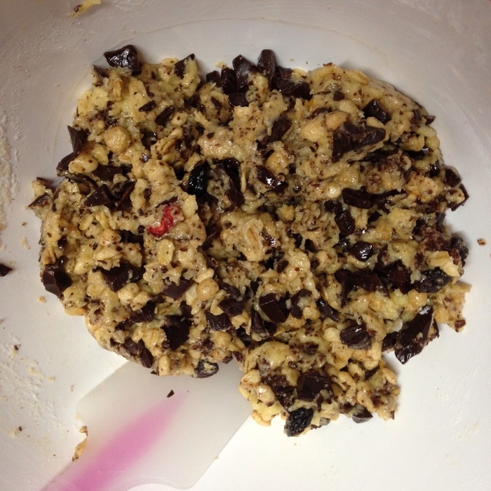 写真のように、ホットケーキミックスが8〜9割混ざって、少し粉っぽさがまだ残ってるかな…くらいでグラノーラ&チョコ投入!