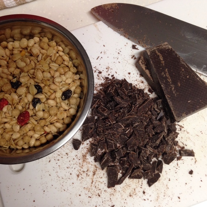 ❶板チョコは包丁でお好みの大きさに砕いて、グラノーラとあわせておく。