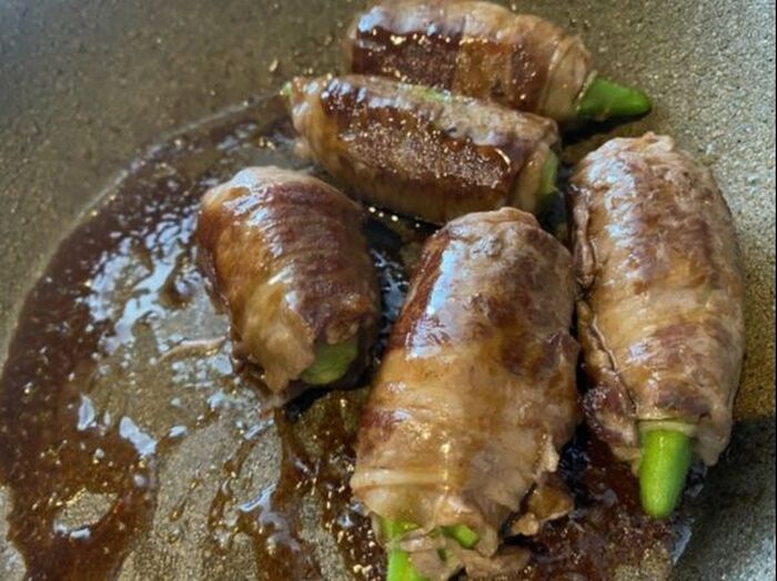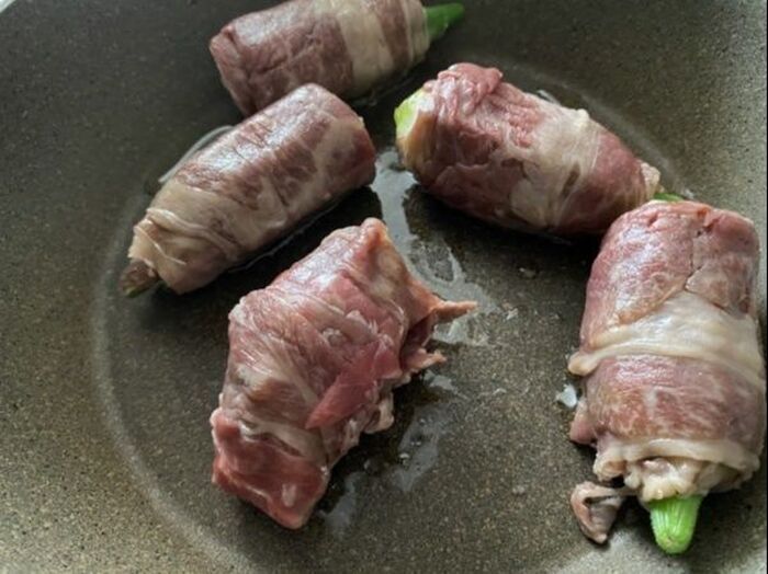 フライパンに米油を入れ肉の巻き止めを下にして焼いていく