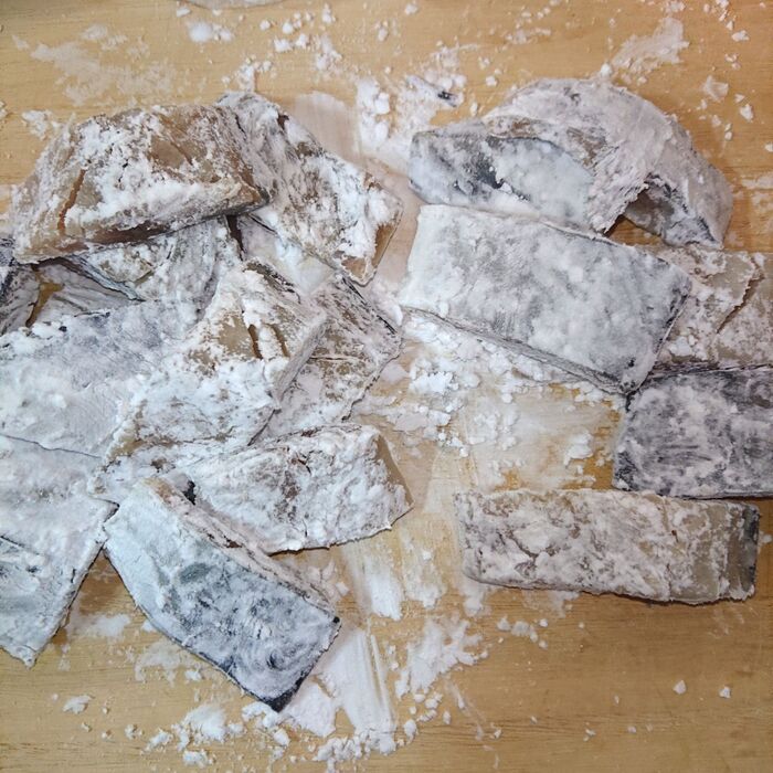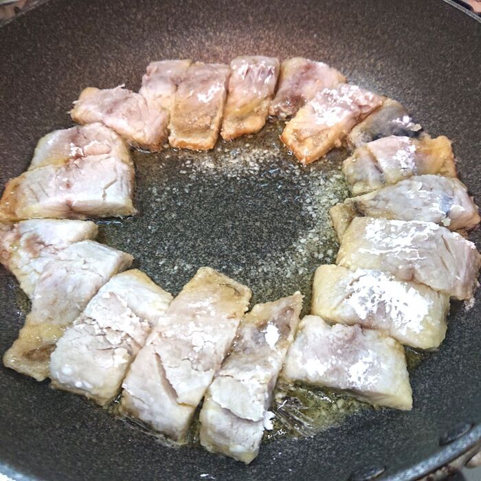片栗粉を塩さばにまぶす。