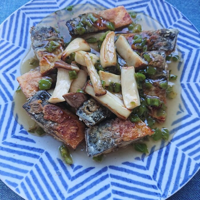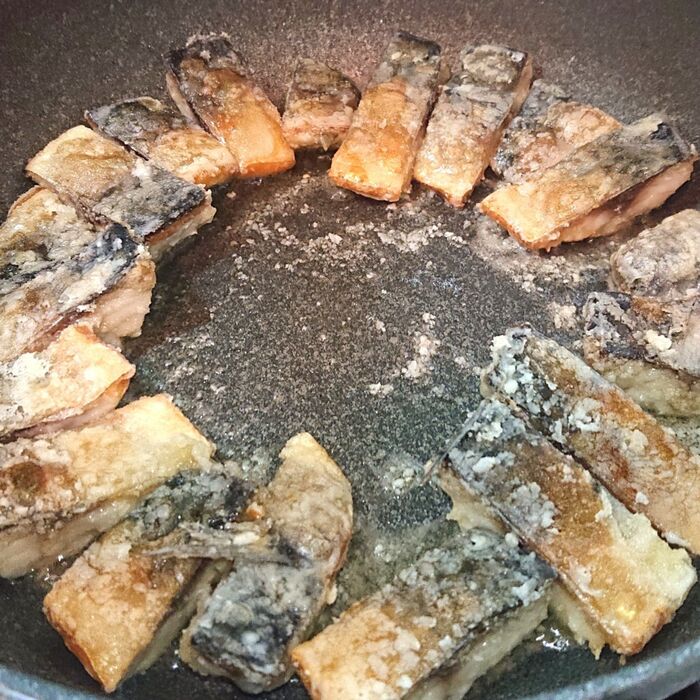 フライパンに油を入れて熱し、塩さばを皮目から並べ入れる。