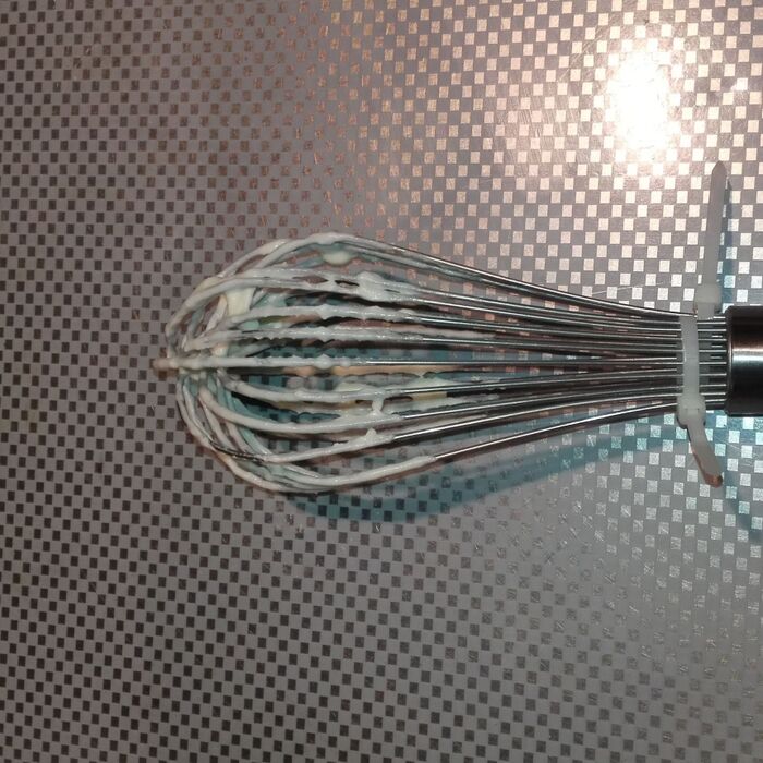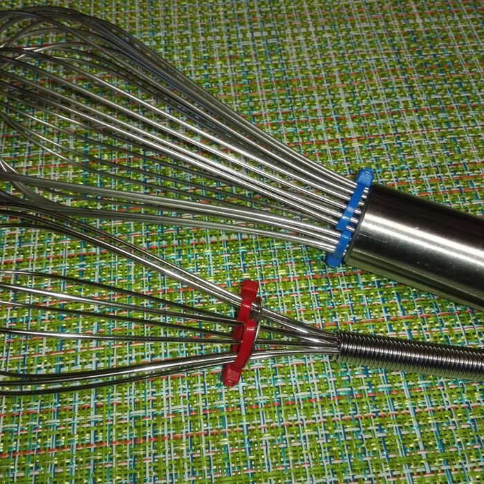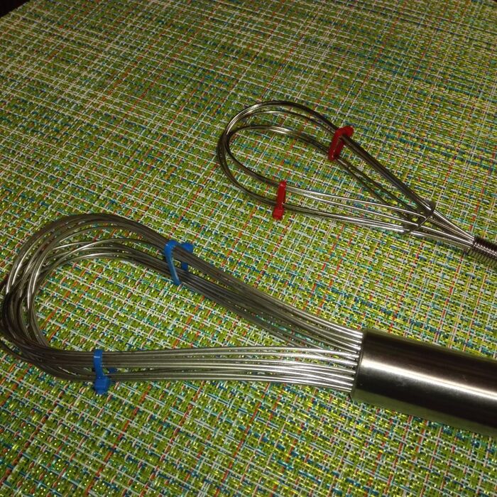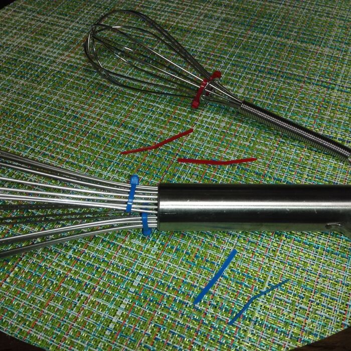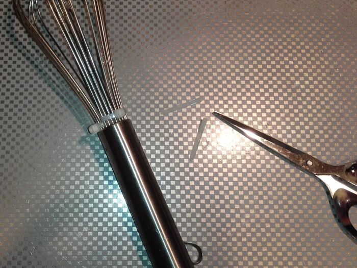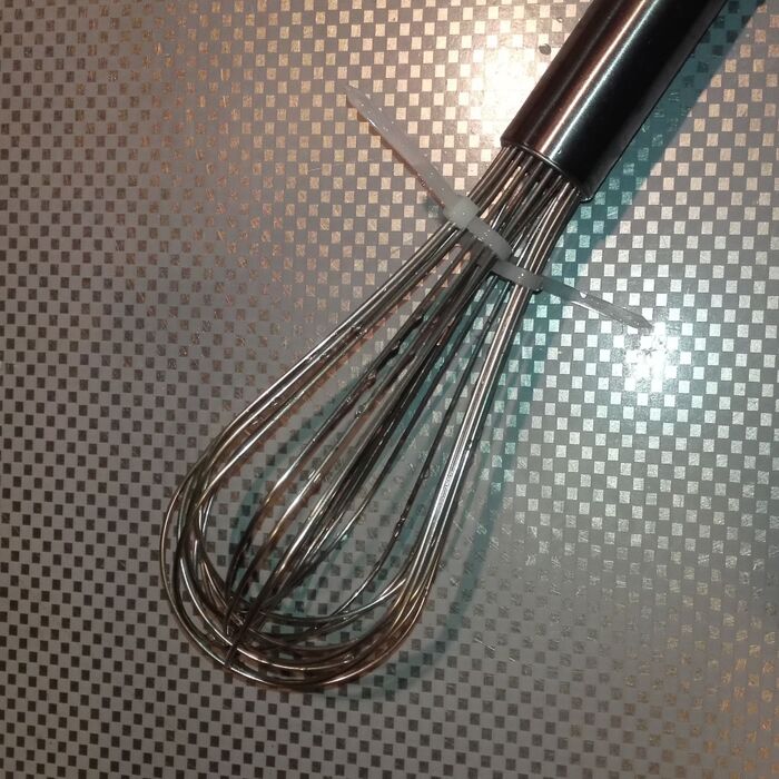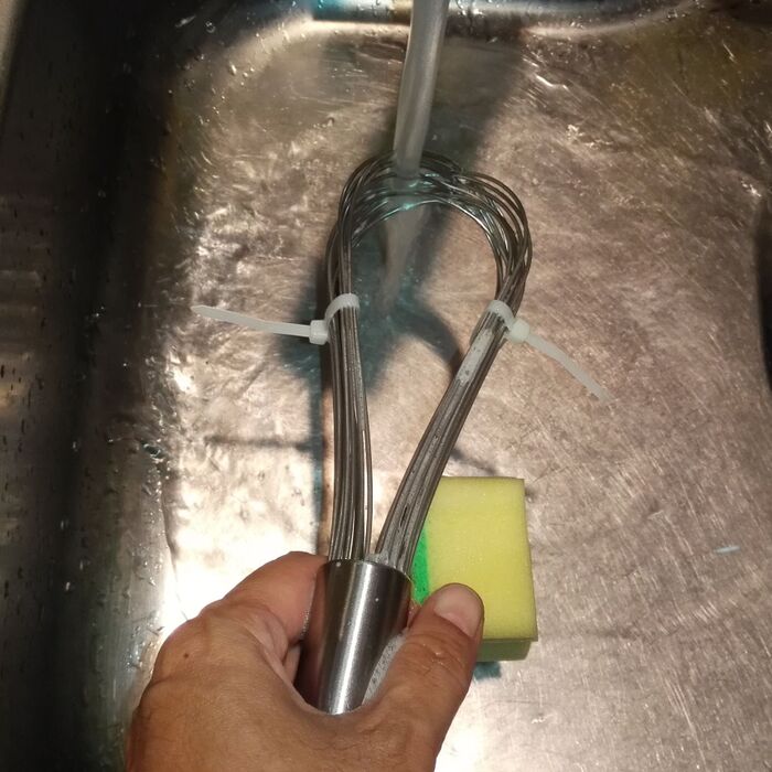 安いホイッパーだと、片手でも洗いながら2つに広げる事が出来ますが、ちょっと高いホイッパーはしっかりしていて片手では広がらないので、結束バンドをしています。