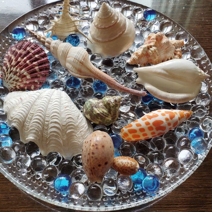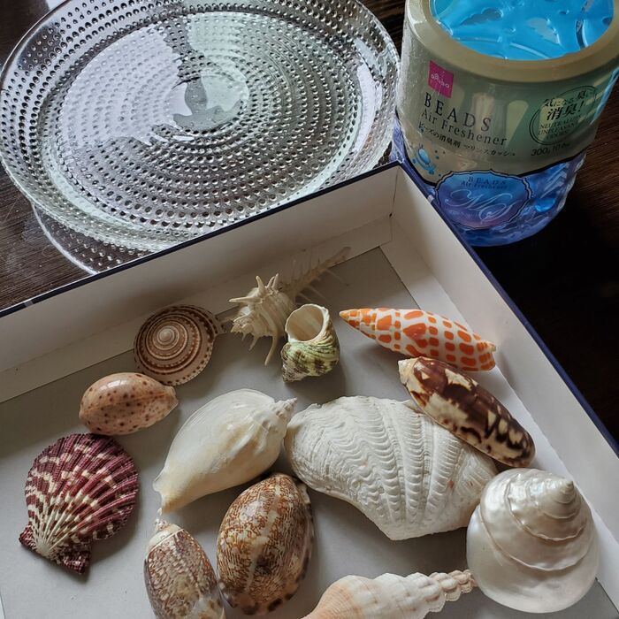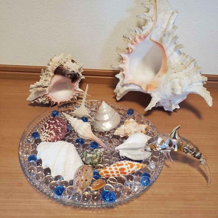 ガラスのオブジェや大きな貝殻と一緒に玄関に置きました。