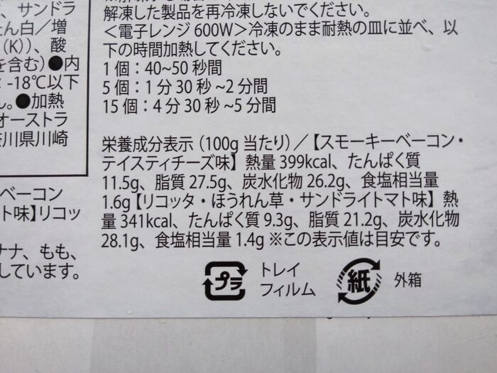 小麦粉、卵、クリーム、リコッタ(ホエイ、生乳、食塩)、ナチュラルチーズ、玉ねぎ、ショートニング、無塩バター、ほうれん草、サンドライトマト、ホエイパウダー、食塩、にんにく、香辛料、小麦たん白/増粘剤(加工でん粉)、膨脹剤、酸味料、保存料(ソルビン酸(K))、酸化防止剤(V.E)、でん粉(一部に小麦・卵・乳成分・大豆を含む)